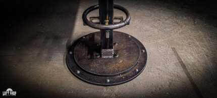 Konstrukcja stołu została wykonana z surowej stali, która zachowuje swój naturalny, industrialny wygląd. Widoczne spawy, struktura metalu oraz ciężka, stabilna rama nadają całości fabryczny, warsztatowy charakter.